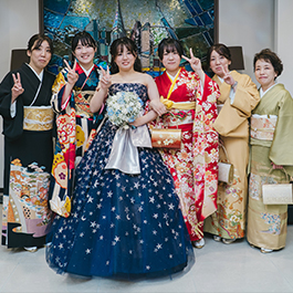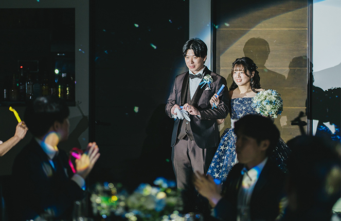 受付時にドレス当てクイズの案内を用意しておき、ケミカルライトを1人1色選んでもらい披露宴がスタート。カラードレスへお色直しをして大階段から再入場した際は会場中がカラフルな光に彩られ、まるで私たちがアイドルにでもなったような感覚になり貴重な経験ができました。