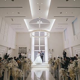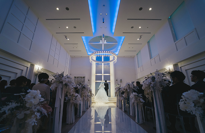 窓から陽光が差し込み、光の輪のようなクリスタルが輝く空間から、ブルーのライティングでチャペルの雰囲気が一変し、幻想的なムードに包まれたのが印象的でした。